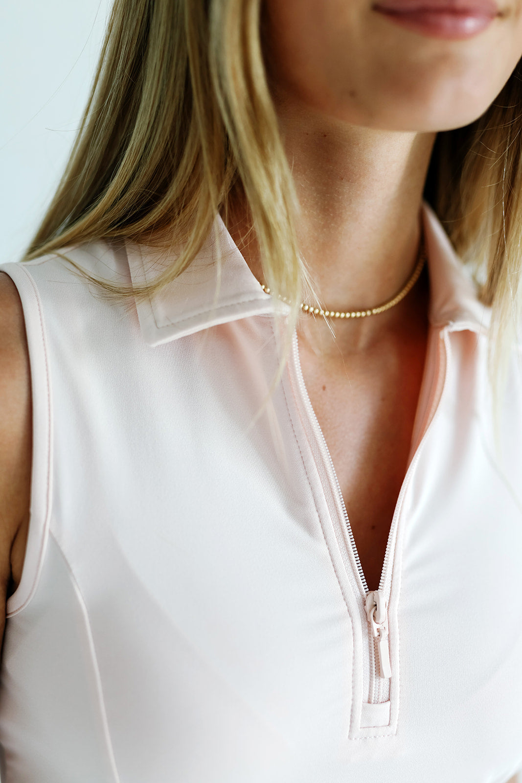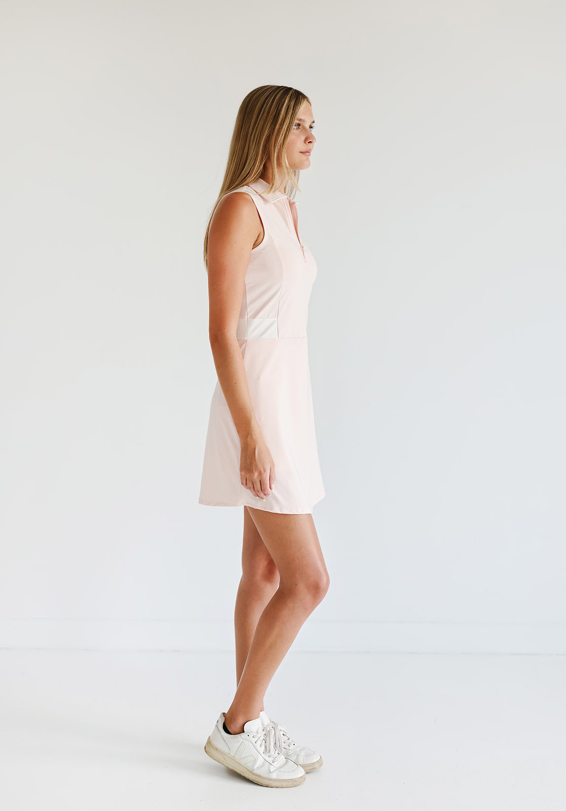 A fresh twist on tradition—this sleeveless collared dress features a sporty quarter zip, contrast detailing at the waist, and detached shorts with pockets that actually do something. Made from our signature sweat-wicking fabric so you can look sharp and stay cool, all round long.